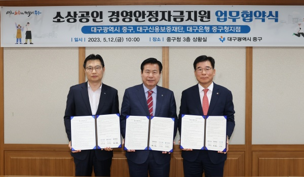 대구 중구청(구청장 류규하)은 코로나19 이후에도 고금리, 고물가로 어려움을 겪고 있는 소상공인의 자금조달을 지원하기 위하여 대구신용보증재단과 ㈜대구은행 중구청지점과 3자 업무협약을 5월 12일 전격 체결했다.