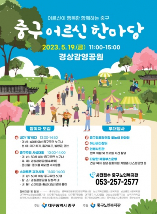 대구 중구(구청장 류규하)는 5월 19일 경상감영공원에서 ‘어르신이 행복한 함께하는 중구’ 『2023 중구어르신한마당』을 개최한다.