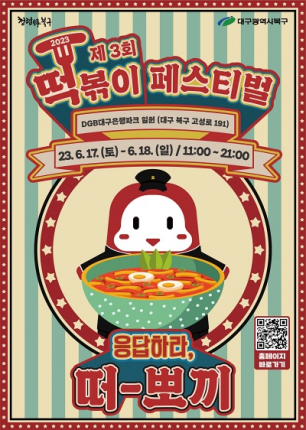 대구 북구청(청장 배광식)은 6월 17일, 18일 양일간 “제3회 떡볶이 페스티벌”을 DGB 대구은행 파크 일원에서 개최한다고 밝혔다.