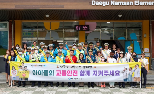 대구 중구청(구청장 류규하)은 중부경찰서(서장 정근호), 남산초등학교(교장 장윤옥), 모범운전자회, 녹색어머니회와 함께 5월 26일 남산초등학교 어린이보호구역 및 통학로 안전시설을 점검하고 등굣길 어린이 교통안전지도 캠페인을 실시했다.