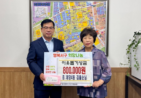 6월 19일 내당4동 김을순 님은 지난 15일 제66회 보화상으로 받은 상금 80만원 전액을 이웃돕기 성금으로 기탁하였다.