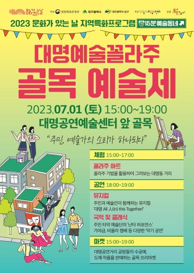 대구 남구는 문화체육관광부의 ‘2023 지역특화프로그램 <문화가 있는 날>’ 공모사업에 선정되어 추진하는 사업으로 6월부터 10월까지 매월 마지막 주 문화가 있는 날 주간마다 다채로운 문화 프로그램을 선보이고 있으며, 그 첫 프로그램으로 오는 7월 1일 대명공연거리에서 주민과 예술가가 함께하는 대명예술꼴라주가 개최된다.