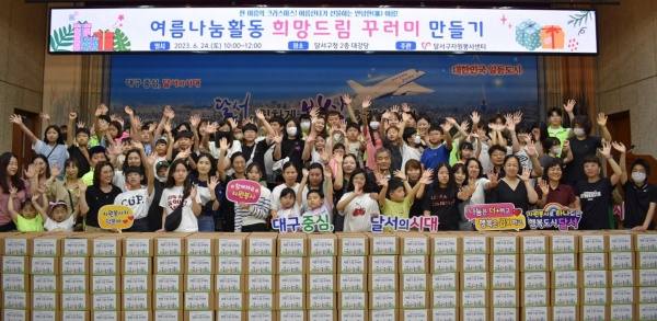 이 행사는 달서구자원봉사센터(센터장 권혁환) 주관으로 홀몸어르신 등 취약계층 이웃들이 무더운 여름을 시원하고 건강하게 보낼 수 있도록 400세대에 전달할 희망드림 꾸러미 만들기 봉사활동이다.