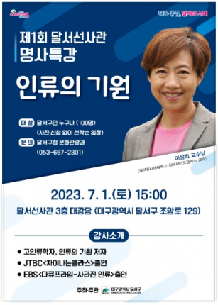 대구 달서구(구청장 이태훈)는 오는 7월 1일(토) 오후3시 달서선사관(조암로129) 3층 대강당에서 ‘제1회 달서선사관 명사특강’을 개최한다고 밝혔다.