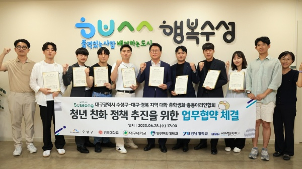 대구 수성구(구청장 김대권)와 대구·경북 4개 대학 총학생회·총동아리연합회는 지난 28일 수성구청 소회의실에서 청년 친화 정책 추진 및 상호교류를 위한 업무협약을 체결했다.