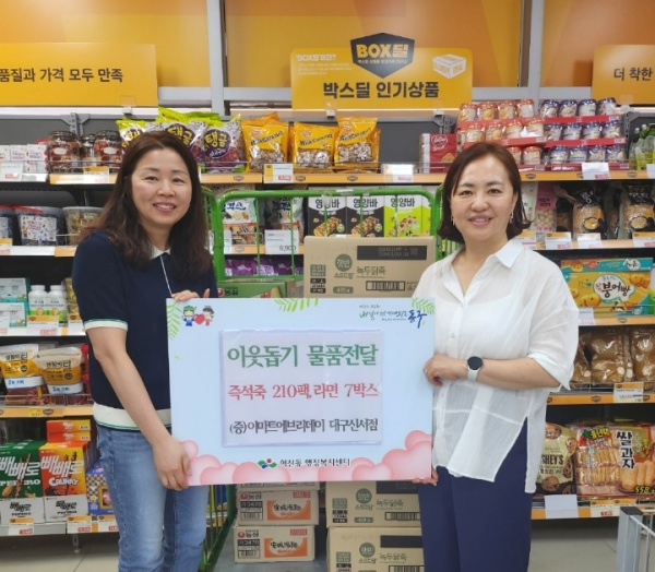 대구 동구 혁신동에 소재한 ‘이마트에브리데이 대구신서점’(대표 한승훈)은 지난 4일, 혁신동 행정복지센터에 즉석죽 210팩과 라면7박스를 기탁했다.
