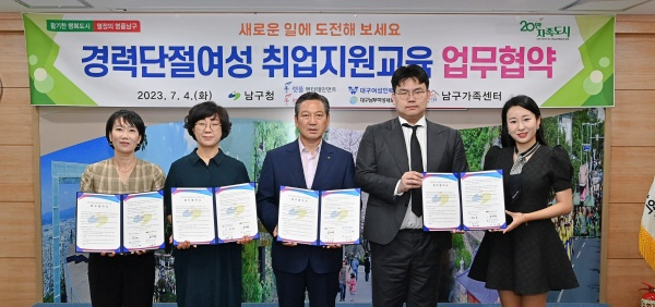 대구광역시 남구청(구청장 조재구)은 지난 4일, 렛플 엔터테인먼트(대표 유승엽), 렛플 아카데미(대표 최지안), 대구여성인력개발센터(관장 이미영), 대구남구가족센터(센터장 권지영)와 함께 대구광역시 남구 경력단절 여성들의 취업교육 및 지원을 위한 업무 협약을 체결했다고 7일 밝혔다.