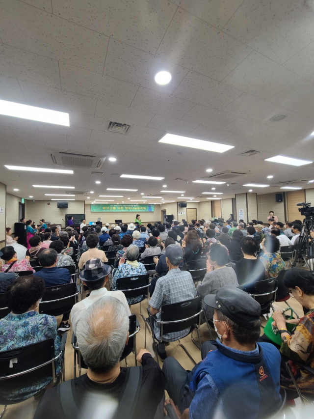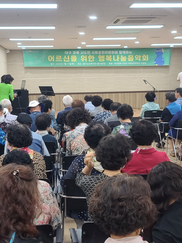7월11일 오전 10시30분부터 대구 중구 노인복지관 대강당에서 어르신 200여명을 모시고 초복 행사 겸 대구경북시도민 사회공헌위원회 에서 (사)박약회 후원으로 25번째 어르신을 위한 행복나눔 음악회를 가졌다.