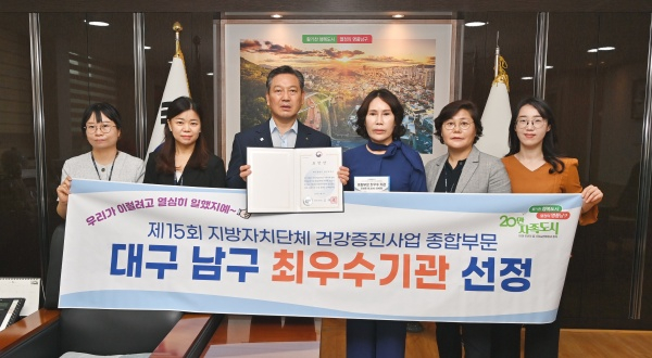 대구광역시 남구청(구청장 조재구)은 지난 7일, 보건복지부에서 주관하는 ‘제15회 지방자치단체 건강증진사업 성과대회’에서 종합 부문 최우수기관으로 선정되어 보건복지부 장관 표창을 받았다고 11일 밝혔다.