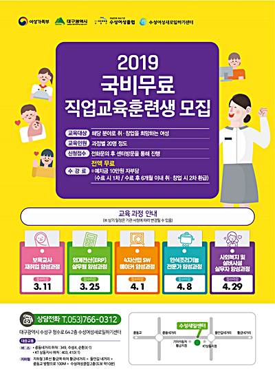 모든 직업교육훈련과정은 하루 4시간, 과정별 3개월 정도 진행되며, 신청을 희망하는 여성은 보육교사 재취업 3월 11일까지, 회계전산(ERP)실무원 3월 25일까지, 4차산업 SW 메이커 4월 1일까지, 한식조리기능전문가 4월 8일까지, 사회복지 및 실버시설 실무자 4월 29일까지 수성새로일하기센터(☎053-766-0312)로 방문·접수하면 된다. [시군향우회인터넷뉴스=정미진기자]