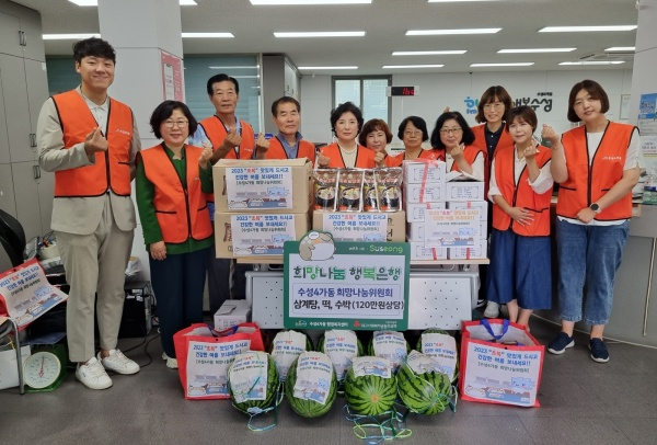 | ↑↑ 대구 수성4가동 희망나눔위원회(위원장 이명자)는 지난 11일 초복을 맞아 관내 공설경로당 3곳과 범어지구대에 전달해 달라며 삼계탕, 떡, 수박(총 120만원 상당)을 수성4가동 행정복지센터에 기탁 후 기념 촬영하고 있다. |