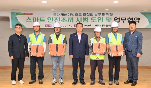 대구광역시 남구청(구청장 조재구)은 지난 14일, 주식회사 KSNT(대표이사 양원석)과 공무직 근로자 중대재해예방을 위한 스마트 안전조끼 시범 도입 및 업무협약을 체결하였다고 17일 밝혔다.