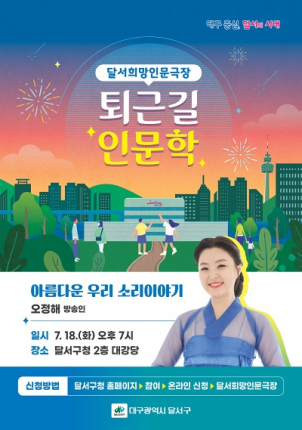 이태훈 달서구청장은 “달서희망인문극장 운영으로 구민 누구나 쉽게 인문학을 접하고 하절기 무더위를 피해 야간 퇴근길 인문학 인문학적 소양을 높이고 감동과 힐링의 시간이 되길 바란다”고 말했다.