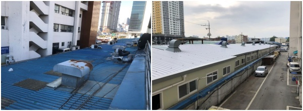 | ↑↑ 중구 번개시장, 시설 현대화 사업 완료, 지붕, 벽체 시공전(좌), 지붕, 벽체 시공후(우) |