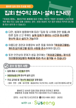 대구 수성구(구청장 김대권)는 올바른 집회문화 정착과 안전한 생활환경 조성을 위해 수성경찰서와 함께 ‘집회 현수막 표시·설치 안내문’을 제작해 배부하고 있다고 밝혔다.
