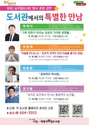 2023년 남구립도서관 명사 초청 강연과 관련된 사항은 남구립도서관 홈페이지(https://library.daegu.go.kr/namdm/, https://library.daegu.go.kr/namic)에서 확인할 수 있으며 자세한 사항은 남구립도서관(☎664-3553)으로 문의하면 된다.