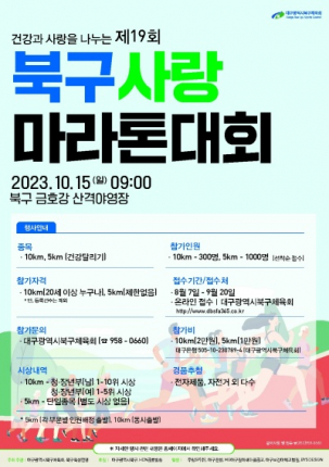 제19회 북구사랑 마라톤대회가 10월 15일(일) 금호강 산격야영장 일원에서 개최되며, 참가 신청은 8월 7일부터 9월 20일까지 선착순으로 접수한다.