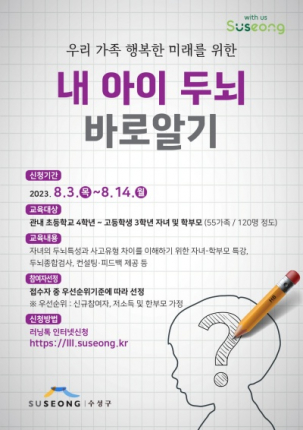 대구 수성구(구청장 김대권)는 이달 26일부터 10월 31일까지 4학년에서 고등학교 3학년까지 학생과 그 학부모를 대상으로 ‘내 아이 두뇌 바로알기’ 프로그램을 운영한다고 밝혔다.