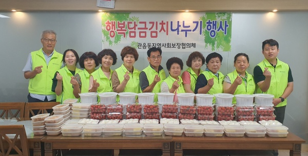관음동 지역사회보장협의체의 행복담금김치 나누기 사업은 2022년 사회복지공동모금회 착한대구 캠페인을 통해 관음동에서 모금된 성금으로 김장철을 제외한 시기에 저소득 독거노인에게 김치를 전달함으로써 어르신들의 안부를 확인하는 정서 지원 사업이다.
