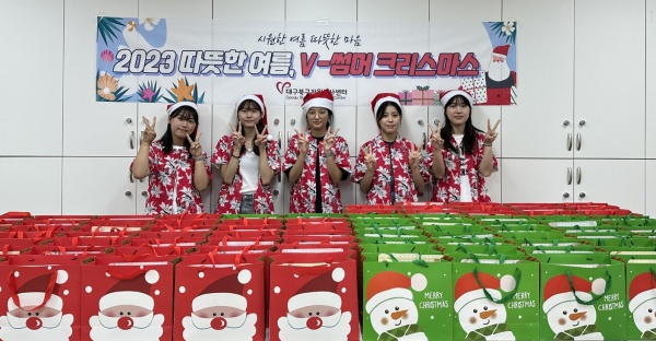 ‘2023 따뜻한 여름, V-썸머크리스마스’는 대학생 자원봉사자들이 아동들의 더위를 식혀줄 여름용품 및 실내놀잇감, 학용품 등의 선물꾸러미를 직접 제작하여 전달하는 자원봉사활동이다.
