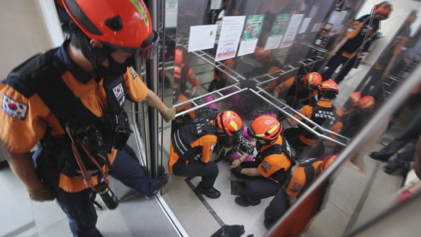 이날 훈련은 중부소방서, 한국승강기안전공단, 월드엘리베이터(유지관리)와 합동으로 승강기 이용 중 정전으로 인한 승강기 사고 상황을 연출해 신속한 대응능력 강화에 중점을 두고 ▲비상 신고 접수 ▲현장 출동 ▲정황 파악 ▲사고자 구조 ▲현장 복구 순으로 훈련을 진행했다.