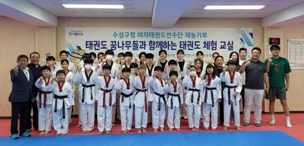 수성구청 여자태권도선수단은 2015년 창단 후 매년 각종 대회를 석권하고 국가대표 선수를 배출하는 등 국내 최강 명문 실업팀으로 활약을 보여주고 있다. 훈련과 대회 참가에 지장이 없는 범위 내에서 지역사회 공헌을 위해 꾸준하게 재능기부를 추진할 예정이다.