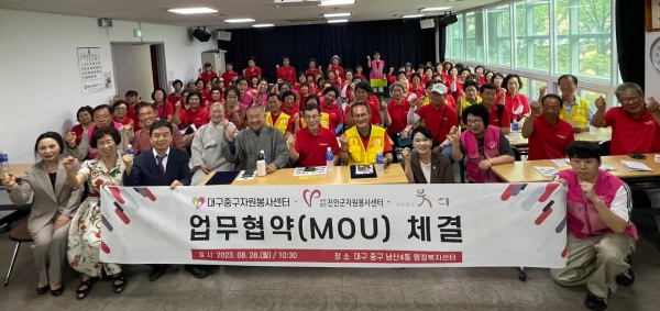 대구 중구 자원봉사센터(센터장 윤보경)는 지난 8월 28일 중구 자원봉사센터(남산로4길 45)에서 진안군자원봉사센터, 붓다봉사단와 협약을 체결하고 자원봉사활성화 및 해외자원봉사활동의 원활한 운영을 위해 협력하기로 했다.