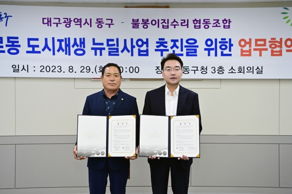 대구 동구청(구청장 윤석준)은 지난 29일, 민관이 함께하는 성공적인 불로동 도시재생 뉴딜사업을 위해 불봉이수리소 협동조합과 업무협약을 했다.