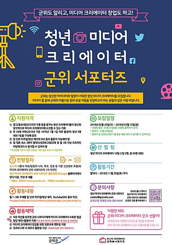 군위군(군수 김영만)은 지난 20일부터 창의적이고 다양한 아이디어를 가진 청년미디어 크리에이터 ‘군위 서포터즈’를 모집한다.