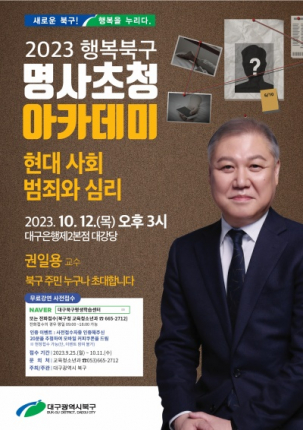 구민들의 문화욕구 충족 및 배움의 기회 확대 등을 위해 북구청이 마련한 「2023 행복북구 명사초청 아카데미」 특강에는 지난 5월 엄홍길 대장, 6월 유홍준 교수, 9월 김상윤 교수의 강연에 이어 10월 권일용 교수를 초빙한다.