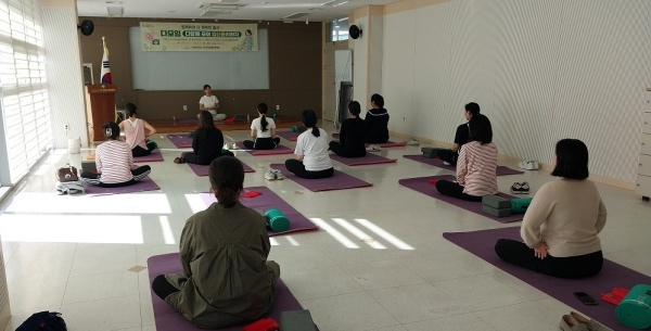| ↑↑ 대구 수성구보건소 고산건강생활지원센터가 운영하는 ‘다모임’ 출산 준비 교실에서 임신부가 요가 수업을 듣고 있다. |