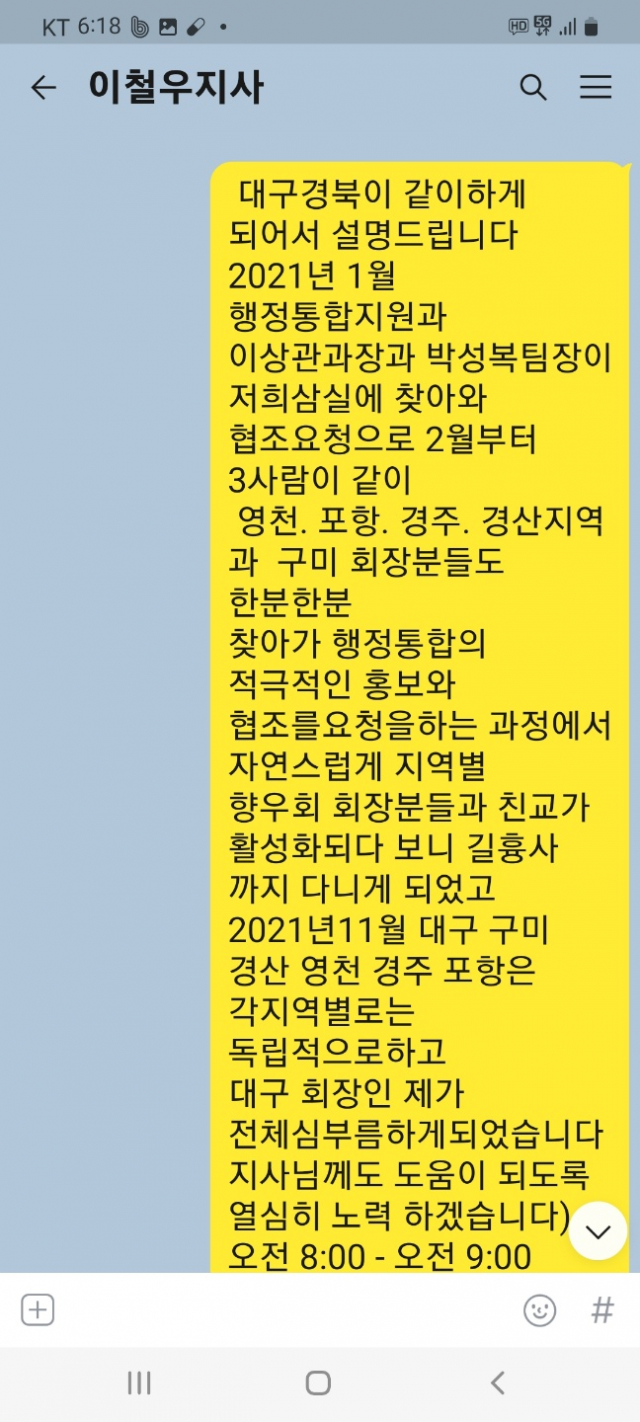 : 도지사님이 대구 경북 행정통합에 (사)재대구경북도민회도 나서줄 것을 얘기해서 재영천, 재포항, 재경주, 재경산, 재구미, 재청도, 재상주 등 각지역의 향우회 회장분들을 1년 넘는 시간동안 일일이 찾아다니며 행정통합 설명을 하다보니 각 지역 회장님들의 길흉사에도 다니게 돼 친해지자 자연스럽게 의견들이 취합되어 2021년 11월 결성하게 되었고, 권시장님은 대구시청에 간김에 직접 만나 말씀드렸고 도지사님들은 바쁘셔서 카톡으로 바로 설명드렸습니다. 저는 그때 (사)재대구경북도민회 회장으로 양쪽을 같이 맡아하게 되었습니다.