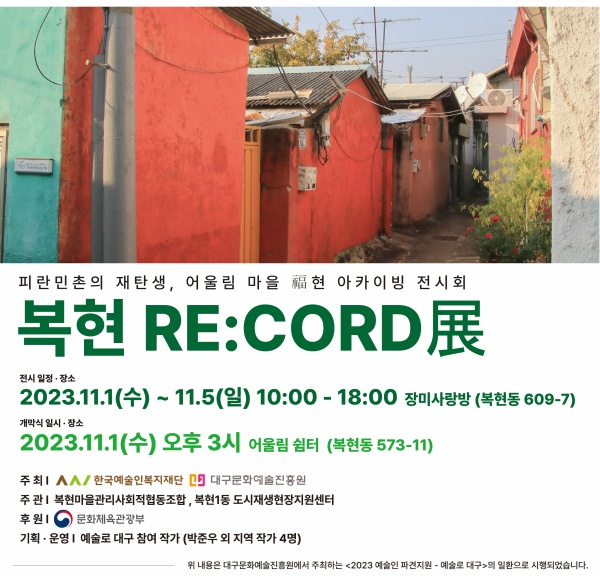 「복현마을관리사회적협동조합」은 11월 1일(수)부터 5일(일)까지 주민 공유공간인 장미사랑방에서 마을 아카이빙 전시회 ‘복현 RE:CORD展’을 개최한다.