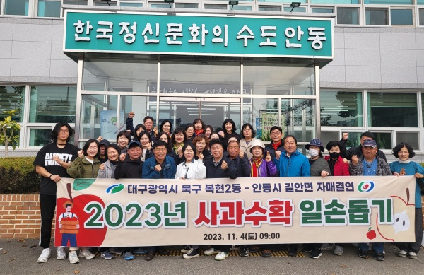 대구 북구 복현2동 행정복지센터(동장 장선아) 및 조직단체회원 30명은 11월 4일(토) 자매결연 도시인 안동시 길안면 사과 농가를 방문해 길안면 행정복지센터 직원 등과 함께 농촌일손 돕기에 나섰다.