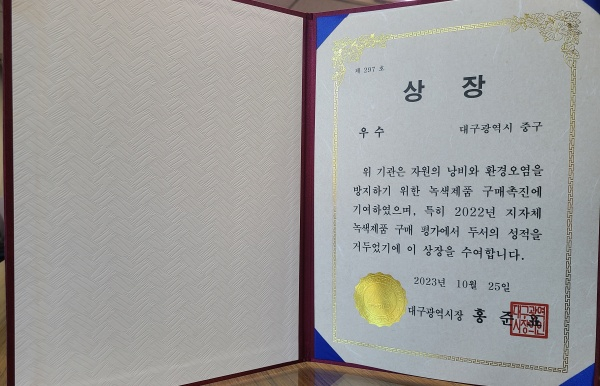 대구 중구(구청장 류규하)는 지난 10월 25일 대구시 합동평가 평가결과 ‘2023년 대구시 공공녹색구매 분야’ 에서 9개구군 중 우수상을 수상했다.