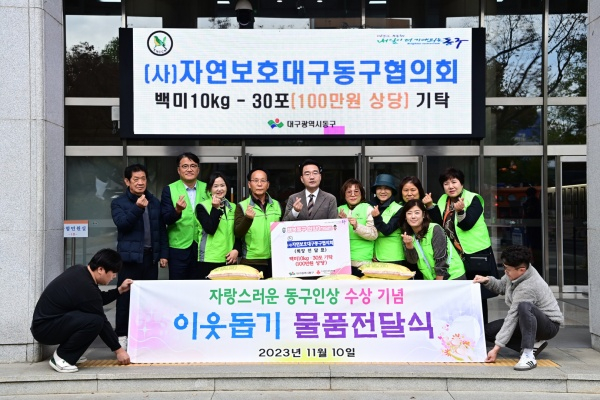 (사)자연보호대구동구협의회(회장 전달표)는 지난 10일 동구청을 방문, 어려운 이웃에게 전달해달라며 백미10kg 30포(100만원 상당)를 기탁했다.