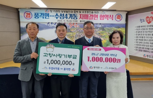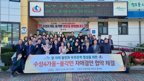 대구 수성구 수성4가동 행정복지센터(동장 고준태)와 경북 청도군 풍각면사무소(면장 이두근)는 15일 자매결연을 체결했다.