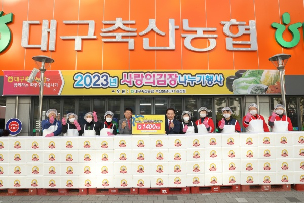 대구축산농협(조합장 최성문)에서는 12월 4일(월) 대구 북구 축산물프라자 침산점에서 취약계층의 따뜻한 겨울나기 지원을 위한 ‘2023년 사랑의 김장 나눔’ 행사를 갖고, 지역 소외계층에 전달해 달라며 김장김치 140박스(630만원 상당)를 대구 북구청(청장 배광식)에 기탁하였다.