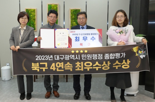2023년 국민행복민원실 인증(행정안전부) 기관인 북구는 보다 편리하고 안전한 민원창구 이용 환경을 조성하고 민원서비스 수준을 향상시켜 대구시 민원행정 종합평가에서 4년 연속 최우수상을 수상했다.