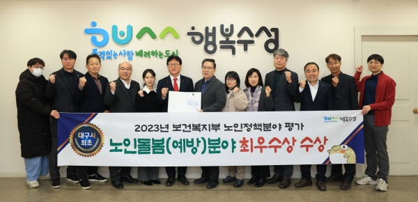 대구 수성구(구청장 김대권)는 ‘2023년 보건복지부 노인정책분야 평가’ 노인돌봄(예방) 분야에서 최우수상 수상과 함께 포상금 1,000만원을 받았다고 27일 밝혔다.