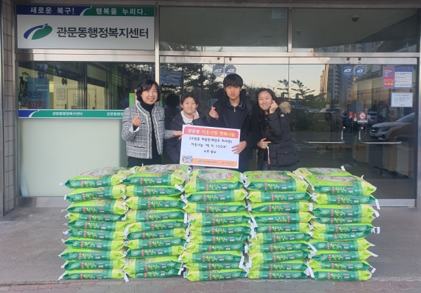 대구 북구 소재 구암중학교 하동헌, 매천초등학교 하서연 학생은 12월 22일(금) 관문동 행정복지센터를 방문하여 관내 저소득 주민을 위해 백미 10kg 100포를 기탁하였다.
