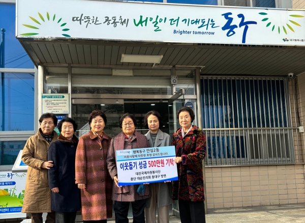 대진국제자원봉사단 종단 대순진리회 동대구 방면 용계회관(선감 이춘옥)은 지난 2일 이웃돕기 성금 500만원을 안심2동 행정복지센터에 기탁하고 전달식을 가졌다.