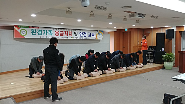 대구광역시 남구청(구청장 조재구)은 지난 27일, 구청 드림피아홀에서 환경가족 120여명을 대상으로 ‘응급처치 및 안전 교육’을 실시했다고 밝혔다.