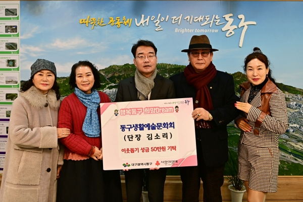 윤석준 동구청장은 “따뜻한 후원을 해주신 동구생활예술문화회에 감사드리며, 기탁해주신 성금은 소중히 전달하겠다.”고 했다.