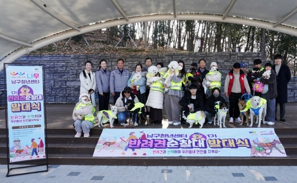 대구 남구 청년센터 반려견 순찰대는 지난 12일 오후 2시 앞산빨래터공원에서 발대식을 개최하였다. 반려견 순찰대는 임명장과 반려견 및 보호자용 순찰 조끼, 반려동물 용품을 수령한 뒤 13일부터 본격적인 활동에 들어선다.