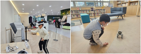 | ↑↑ 달서구 디지털체험센터에서 VR체험 중인 어린이(좌), 달서구 디지털체험센터의 로봇개 루나(우), |