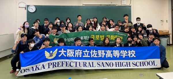 | ↑↑ 지난 17일부터 3박4일간 수성미래교육재단 글로벌 문화탐방 프로그램에 참가한 수성구 학생들이 일본 이즈미사노시에 소재한 오사카 부립 사노고등학교 학생들과 함께 기념 촬영하고 있다. |