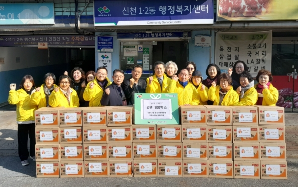 신천1.2동 민간사회안전망위원회(위원장 이윤형)는 지난 1월 31일, 설 명절을 앞두고 라면 100박스(300만원 상당)를 동 행정복지센터에 기탁했다.