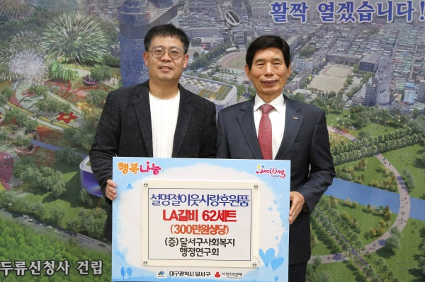 대구 달서구(구청장 이태훈)가 지난 5일 달서구사회복지행정연구회로부터 이웃사랑 후원품(LA갈비 62세트, 300만원상당)을 기탁받았다.