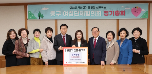 대구 중구 여성단체협의회(회장 정정념)는 8일 중구청(구청장 류규하)에 설맞이 이웃돕기 성금 100만원을 기탁했다.